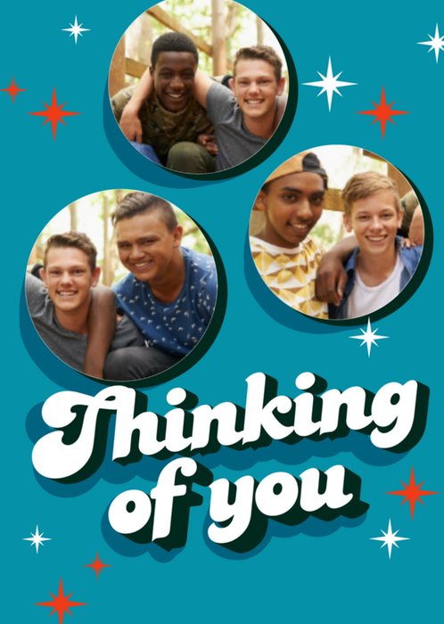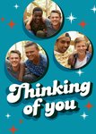 Vrolijke denken aan kaart om naar iemand te sturen met de tekst: Thinking of you. Je kunt drie eigen foto's toevoegen.