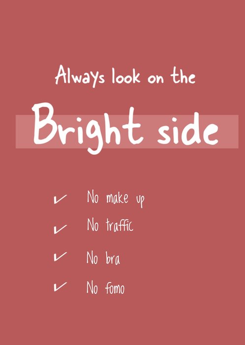 Laat iemand weten dat je aan hem of haar denkt met dit leuke kaartje met een grappige tekst: Always look on the bright side, no make up, no traffic, no bra, no fomo.