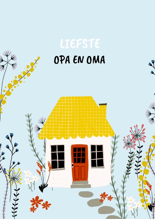 Een lieve denken aan kaart met een huisje en bloemen en de tekst: Liefste opa en oma.