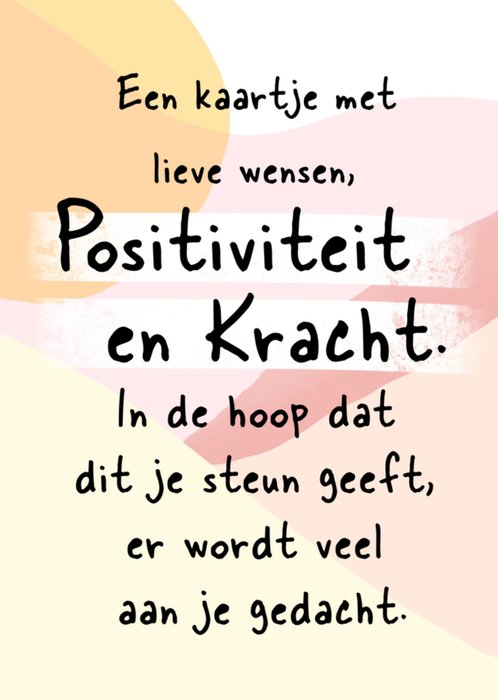 Een kaart om wat positiviteit en kracht te delen met degene die het kan gebruiken. "Een kaartje met lieve wensen, positiviteit en kracht. In de hoop dat dit je steun geeft, er wordt veel aan je gedacht."
