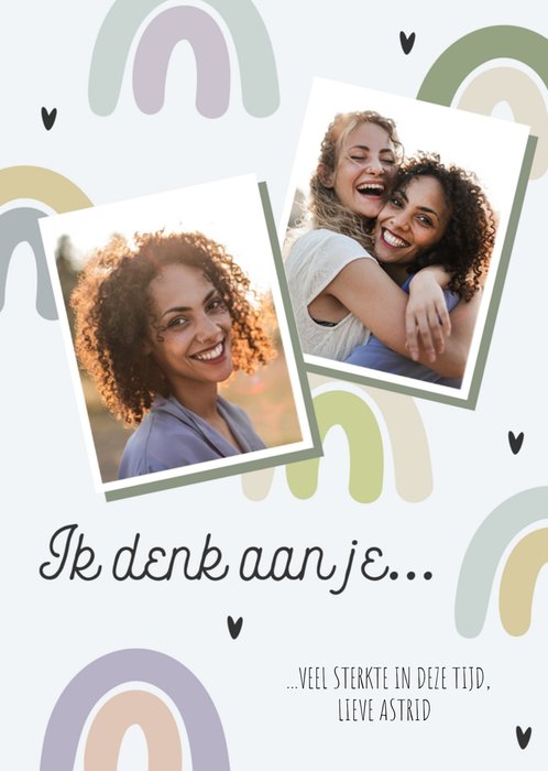 Laat weten dat je aan iemand denkt met deze lieve denken aan kaarten van Luckz. Op de kaart staat: Ik denk aan je...veel sterkte in deze tijd lieve [naam]. Je kunt twee foto's toevoegen.