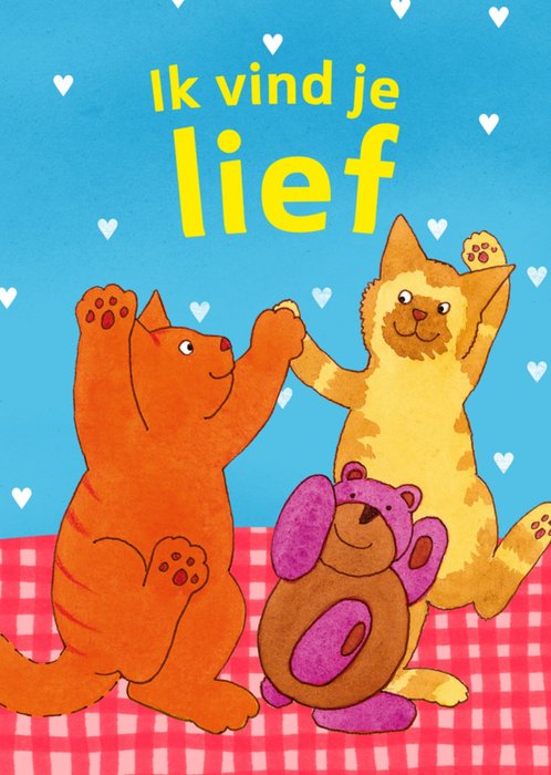Samen is toch altijd leuker dan alleen. Dikkie Dik hupt vrolijk met zijn vriendje rond. Boven hen staat de tekst 'Ik vind je lief'.