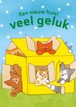 Verhuisd? Stuur dan deze vrolijke kaart van Dikkie Dik. Dikkie Dik zit samen met zijn vriendjes in een zelfgemaakte, kartonnen huis. Bovenaan staat 'Een nieuw huis! Veel geluk.'