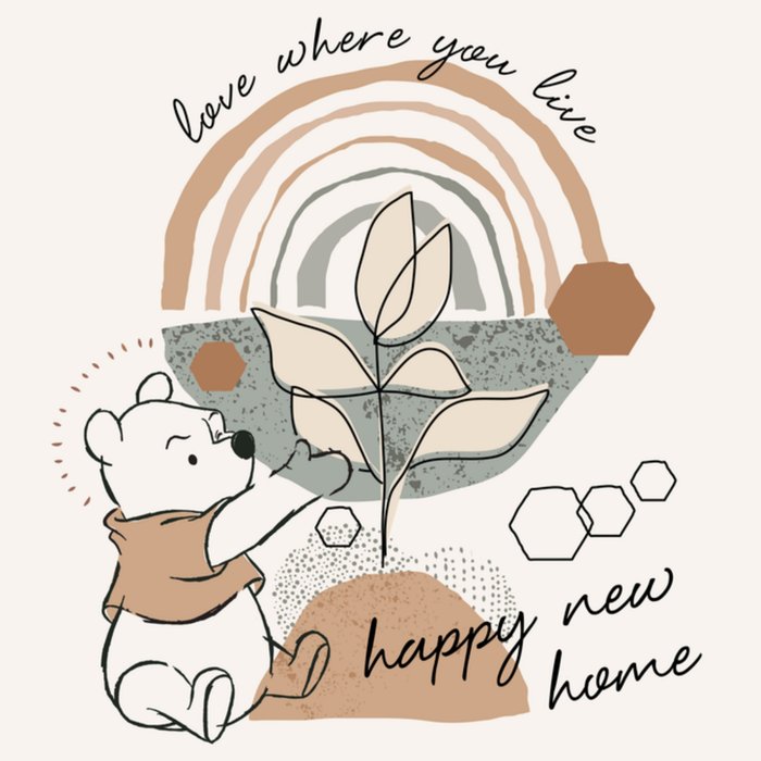 Illustratieve nieuwe woning kaart met Winnie de poeh en de tekst: 'Love where you live. Happy new home'. Verras iemand met deze schattige wenskaart van Disney en Winnie de Poeh.
