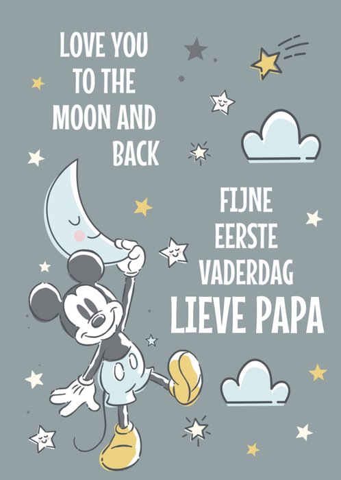 Vrolijke Vaderdagkaart met Mickey Mouse, met maan en sterren, en de tekst: 'Love you to the moon and back. Fijne Eerste Vaderdag lieve Papa'. Verras iemand met deze schattig Vaderdagkaart van Disney en Mickey Mouse.