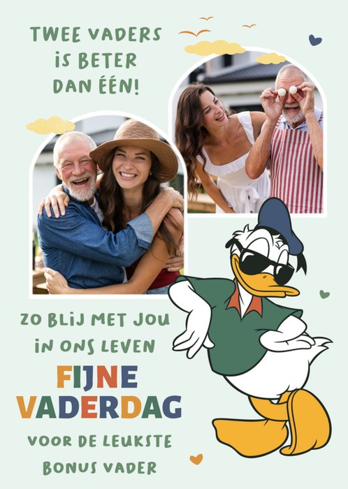 Vrolijke Vaderdagkaart met Donald Duck het dragen van een zonnebril, 2 fotos, en de tekst: 'Twee vaders is beter dan een! Zo blij met jou in ons leven fijne vaderdag voor de leukste bonus vader.' Verras iemand met deze stoere Vaderdagkaart van Disney.