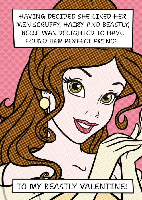 Illustratieve valentijnskaart met Belle en de tekst: 'Having decided she liked her men scruffy, hairy and beastly, ___ was delighted to have found her perfect prince'. Verras jouw liefde met deze valentijnsdag met deze kaart van Disney.