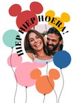 Illustratieve verjaardagskaart met Mickey Mouse-vormige ballonnen en de tekst: 'Hiep Hiep Hoera!'. Verras met deze vrolijke Mickey Mouse Disney Verjaardagskaart.