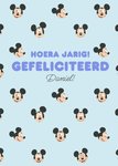 Kleurrijke verjaardagskaart met Mickey Mouse, blauwe achtergrond en de tekst: 'Hoera jarig! Gefeliciteerd'. Verras iemand met deze leuke verjaardagskaart van Disney en Mickey Mouse.