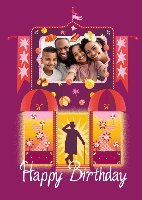 Kleurrijke verjaardagskaart met Mickey Mouse and friends, gestreepte achtergrond, aanpasbare fotos en de tekst: 'Happy Birthday!'. Verras iemand met deze leuke verjaardagskaart van Disney en Mickey Mouse.