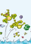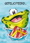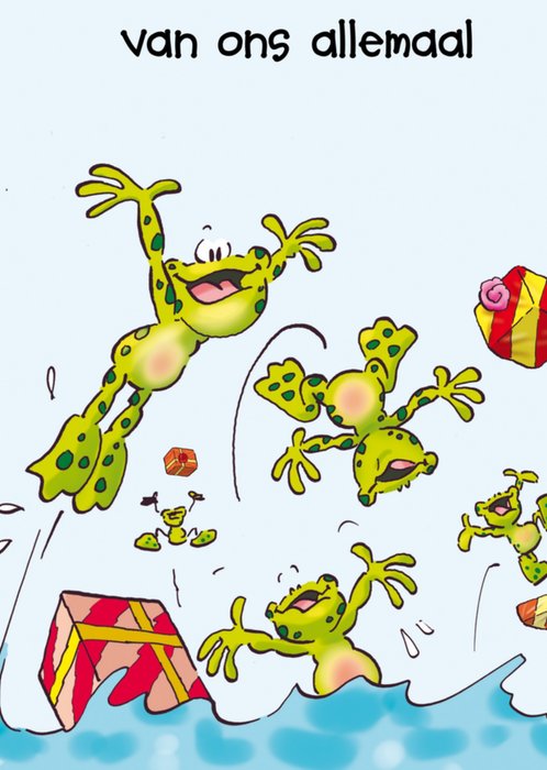 Vrolijke felicitatiekaart met zwemmende kikker op de voorkant om iemand mee te feliciteren. De wenskaart is van Doodles.