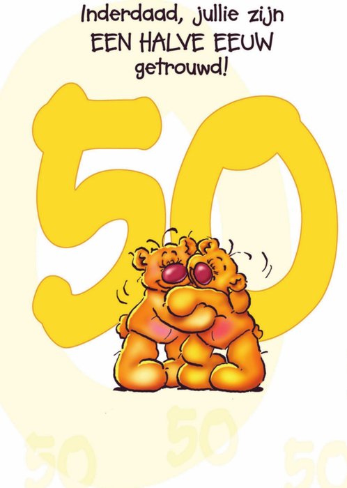 Op deze trouwkaart staat een ouderwets foto van een echtpaar. Hierboven de tekst 'Je zou het niet zeggen, maar het is echt, 50 jaar geleden'.