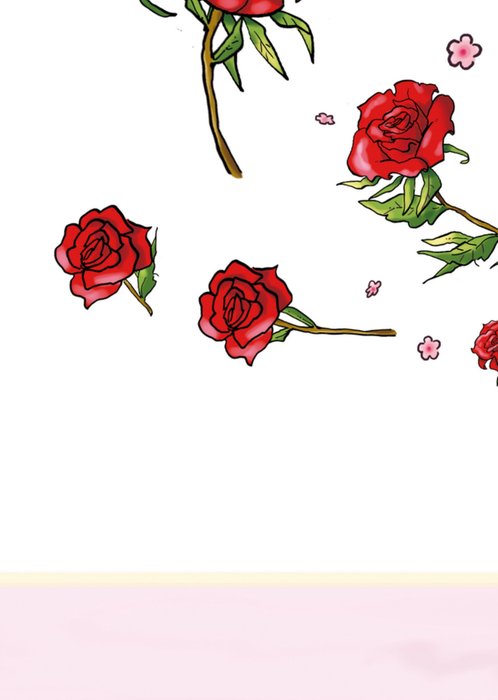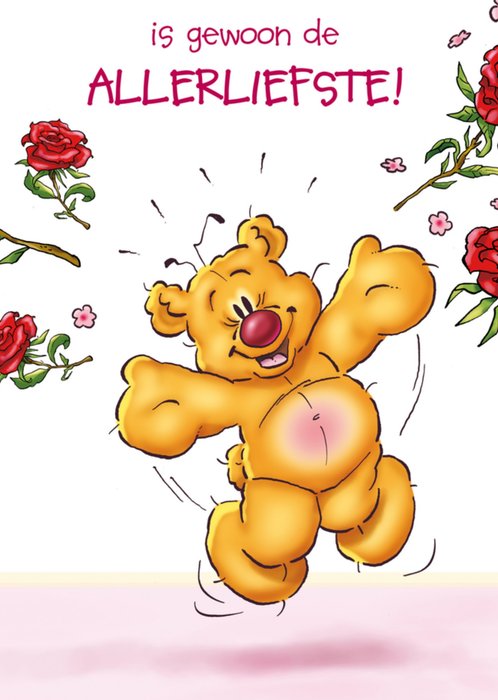 Beer houdt een groot boeket rozen vast. Aan de binnenkant van de kaart springt de beer waardoor de rozen door de lucht vliegen. Op de kaart staat de tekst 'Mijn moeder is gewoon de allerliefste!'