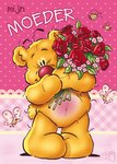 Beer houdt een groot boeket rozen vast. Aan de binnenkant van de kaart springt de beer waardoor de rozen door de lucht vliegen. Op de kaart staat de tekst 'Mijn moeder is gewoon de allerliefste!'