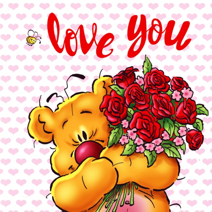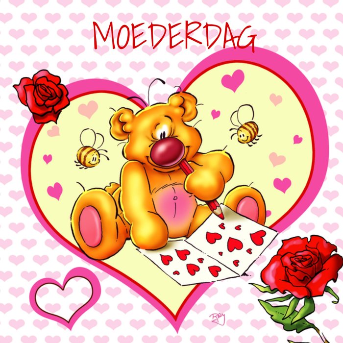 Op deze schattige kaart staat een beer midden in het grote hart afgebeeld, deze beer tekent hartjes in een kaart. Verder zijn er op de kaart nog rozen en bijen te zien. De kaart is afgemaakt met het woord "moederdag".