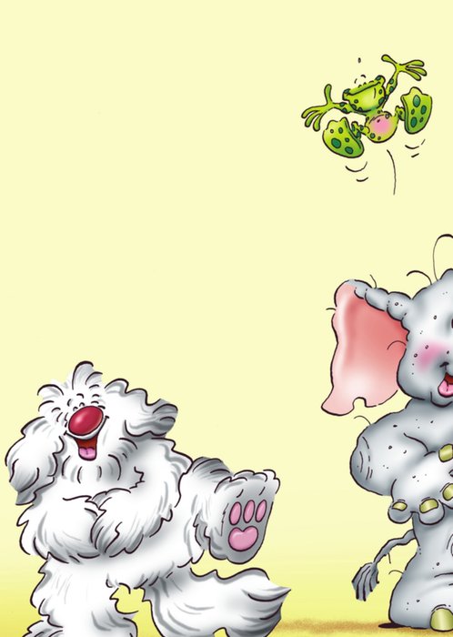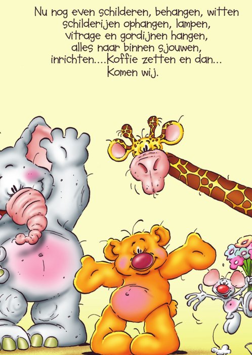 Op deze kaart staat een deur. In het raampje van de deur kan een persoonlijke foto worden geplaatst. 'Een nieuwe woning! Wat leuk!, staat er geschreven boven de deur. Voor de deur zitten een kikker en een muis.