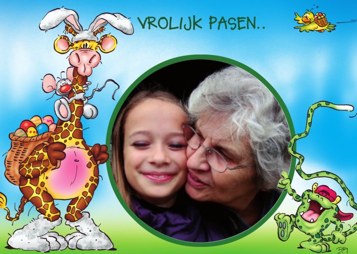 In het midden van deze paaskaart staat een grote cirkel. In deze cirkel kan een persoonlijke foto worden geplaatst. Naast deze cirkel staat een giraffe verkleed als paashaas. Op zijn rug zit een muis.