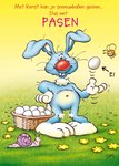 Dit blauwe paaskonijn komt een vrolijke paasgroet brengen. Hij staat klaar om iemand te bekogelen met een paasei. Aan de binnenkant van de kaart heeft hij duidelijk raak gegooid.