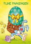 Gele paaskaart van Doodles, met op de kaart een paashaas en een mega groot ei op zijn rug op de voorkant.