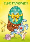 Gele paaskaart van Doodles, met op de kaart een paashaas en een mega groot ei op zijn rug op de voorkant.