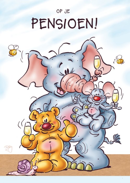 Met deze pensioenkaart maak je iedereen blij! Op deze pensioenkaart van Doodles, staan leuke illustraties van een beertje, een muis en een olifant, die met een glas champane je pensioen vieren!