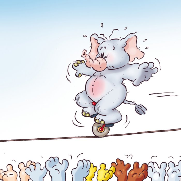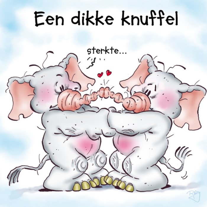 Vrolijke sterktekaart van Doodles, met een afbeelding van olifanten die elkaar een kus geven. De wenskaart is blauw.