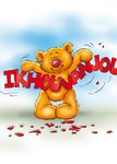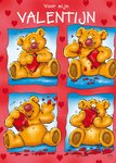 Op deze rode kaart staat een beer vier keer afgebeeld. Hij heeft een rood stuk papier in zijn handen en is hier mee aan het spelen. Boven hem staat: 'Voor mijn Valentijn'.
