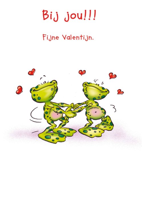 Op deze roze kaart staat een kikker in verschillende houdingen. Om de kikker heen zijn heel veel rode harten te zien. Op de kaart staat: 'Ik ben graag blij, ik ben graag grappig, ik ben graag lief, ik ben graag lui, maar het liefst ben ik graag...'