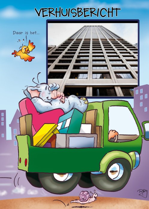 Het sjouwen met dozen is het mist leuke aan verhuizen. Wanneer het helemaal klaar is kan het feest beginnen. De olifant zit boven op de verhuisspullen in de truck. Boven hem in het frame kan een foto van het huis geplaatst worden.