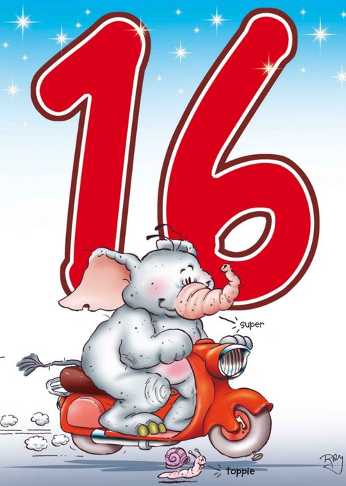 Op deze kaart staat een grote '16'. Daaronder een olifant die voorbij sjeest op zijn scooter. Uit de collectie van Doodles.