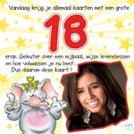 Op deze gele felicitatiekaart kun je een eigen foto binnen het rode vak aan de onderkant plaatsen. Naast de foto staat een olifant met een kikker op zijn hoofd. Aan de bovenkant staat een tekst waarin staat dat iemand vandaag 18 wordt. Uit de collectie van Doodles.