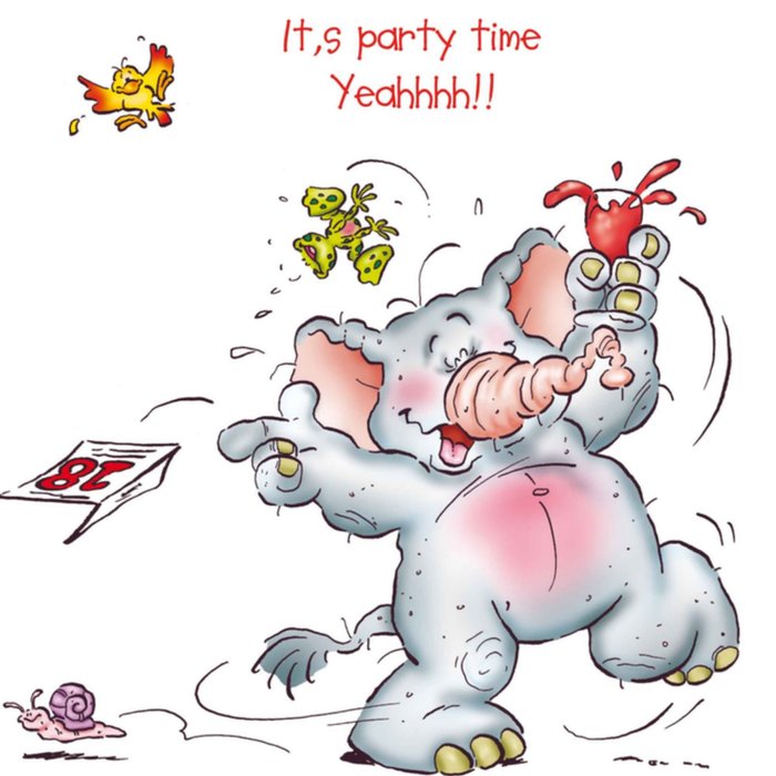 Op deze gele felicitatiekaart kun je een eigen foto binnen het rode vak aan de onderkant plaatsen. Naast de foto staat een olifant met een kikker op zijn hoofd. Aan de bovenkant staat een tekst waarin staat dat iemand vandaag 18 wordt. Uit de collectie van Doodles.