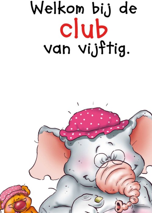 Op deze kaart staat een konijn en ze heeft een kaart in haar handen: 'Club van 50'. Boven het konijn staat: 'Sarah, Je bent het haasje...'Uit de collectie van Doodles.
