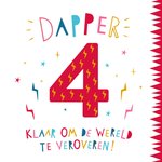 Leuke verjaardagskaart met de tekst: Dapper, 4, klaar om de wereld te veroveren!