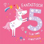 Lieve verjaardagskaart met unicorn en de tekst: Fantastisch 5 tijd voor magische avonturen.