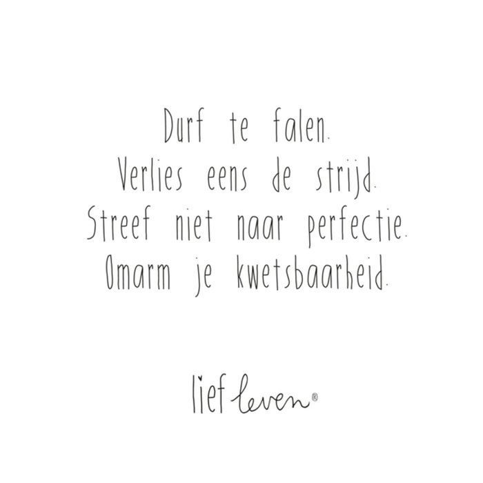 Op deze mooie quote kaart van Lief Leven staat: Durf te valen. Verlies eens de strijd. Streef niet naar perfectie. Omarm je kwetsbaarheid.