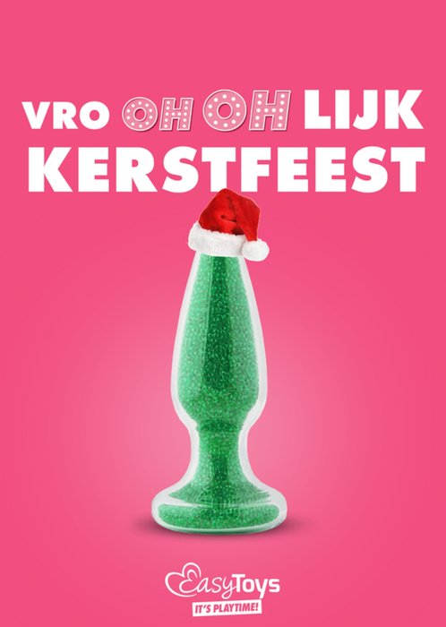 Brutale kerstkaart met een alternatieve kerstboom en de tekst: 'Vro oh oh lijk Kerstfeest.' Verras iemand en laat hen lachen met deze kerstkaart van EasyToys. It's playtime!