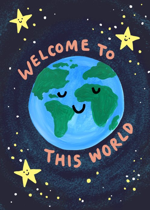 Een charmante en speelse geboortekaart met een glimlachende aarde met een vredige uitdrukking, omringd door vrolijke sterren en een diepe ruimte-achtergrond. De met de hand geschreven tekst "Welkom in Deze Wereld" voegt warmte en een feestelijke sfeer toe, waardoor het een perfecte kaart is om een pasgeborene te verwelkomen.
