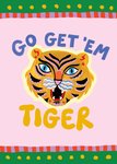 Verras met deze vrolijke kaart met een kleurrijke illustratie van een tijger en de motiverende tekst: "Go Get 'Em Tiger". De kaart is niet aanpasbaar.