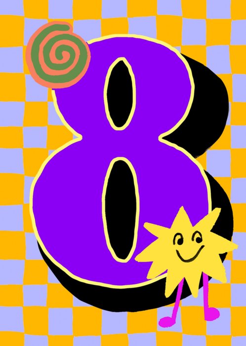Verras iemand met deze vrolijke kaart met een illustratie van een groot nummer acht met een klein negenpuntig sterkarakter op een geblokte achtergrond. De kaart is niet aanpasbaar.