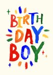 Deze levendige Eleanor Bowmer-wenskaart spat van energie, met een gedurfde, penseelachtige typografie die vrolijk “Birthday Boy” verkondigt tegen een kleurrijke achtergrond bezaaid met sterren.