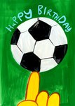 Deze Eleanor Bowmer-wenskaart toont een speelse illustratie van een voetbal ondersteund door een cartoonachtige hand, tegen een levendige groene achtergrond, ideaal voor voetbalfans die hun verjaardag vieren. Het speelse ontwerp past perfect bij de vrolijke boodschap “Happy Birthday,” prominent weergegeven bovenaan.