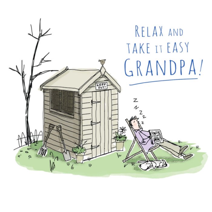 Leuke illustratie van een schuurtje met de tekst: Relax and take it easy grandpa!