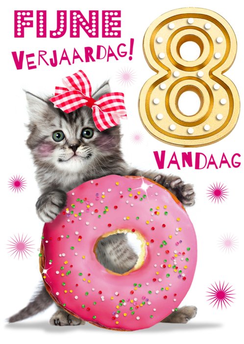 Lieve verjaardagskaart met donut, kat en de leeftijd 8. Een grote verscheidenheid aan stijlen en momenten, dat zijn de kaarten van Emma Proctor.