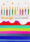 Kleurrijke verjaardagskaart met taart en de tekst: Hartelijk gefeliciteerd.