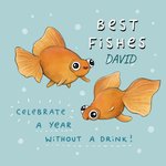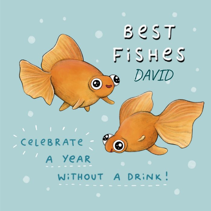 Denken aan kaart met goudvissen en aanpasbare naam. Op de kaart staat: Best fishes [naam] celebrate a year without a drink!