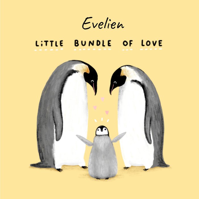 Schattige geboortekaart met naam, pinguins en de tekst: Little bundle of love Grappige illustraties, leuke woordgrappen en schattige dieren. De leuke designs van Felt Studios zijn voor iedereen, voor ieder moment.