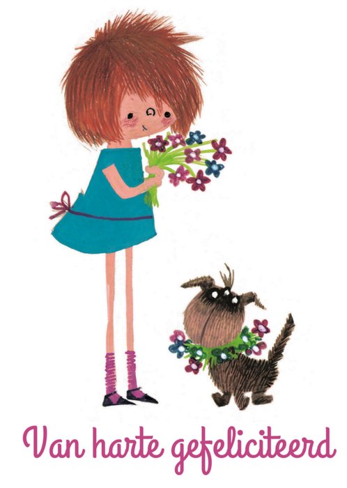 Op deze kaart staat een meisje met een paar bloemen in haar hand. Het hondje draagt de bloemen om zijn nek. Onderaan staat de tekst 'Van harte gefeliciteerd'.