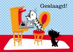 Pim & Pom feliciteren de geslaagde. Een vrolijke kaart van Fiep Westendorp met de tekst: Geslaagd!