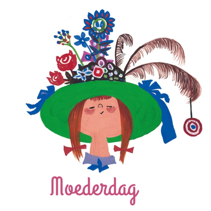 Verras je moeder met deze leuke kaart van Fiep Westendorp. Wat opvalt op deze kaart is de grote, versierde hoed.